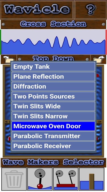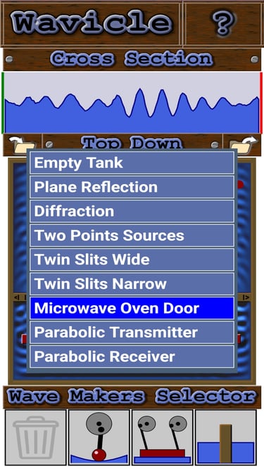The app comes with a collection of pre-defined tank setups to illustrate particular aspects of waves.